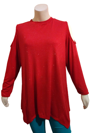 New Red Amore Cold Shoulder Sparkley Top 64% Polyester, 33% Rayon, 3% Spandex