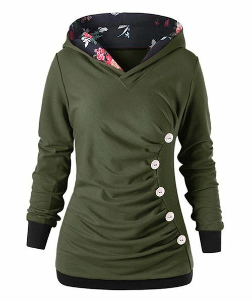 Army Floral-Lined Button-Accent Ruched Hoodie size S