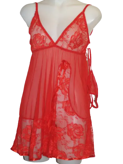 Baby Doll Bow & Lace Detail Top and Panty Thong Set Red