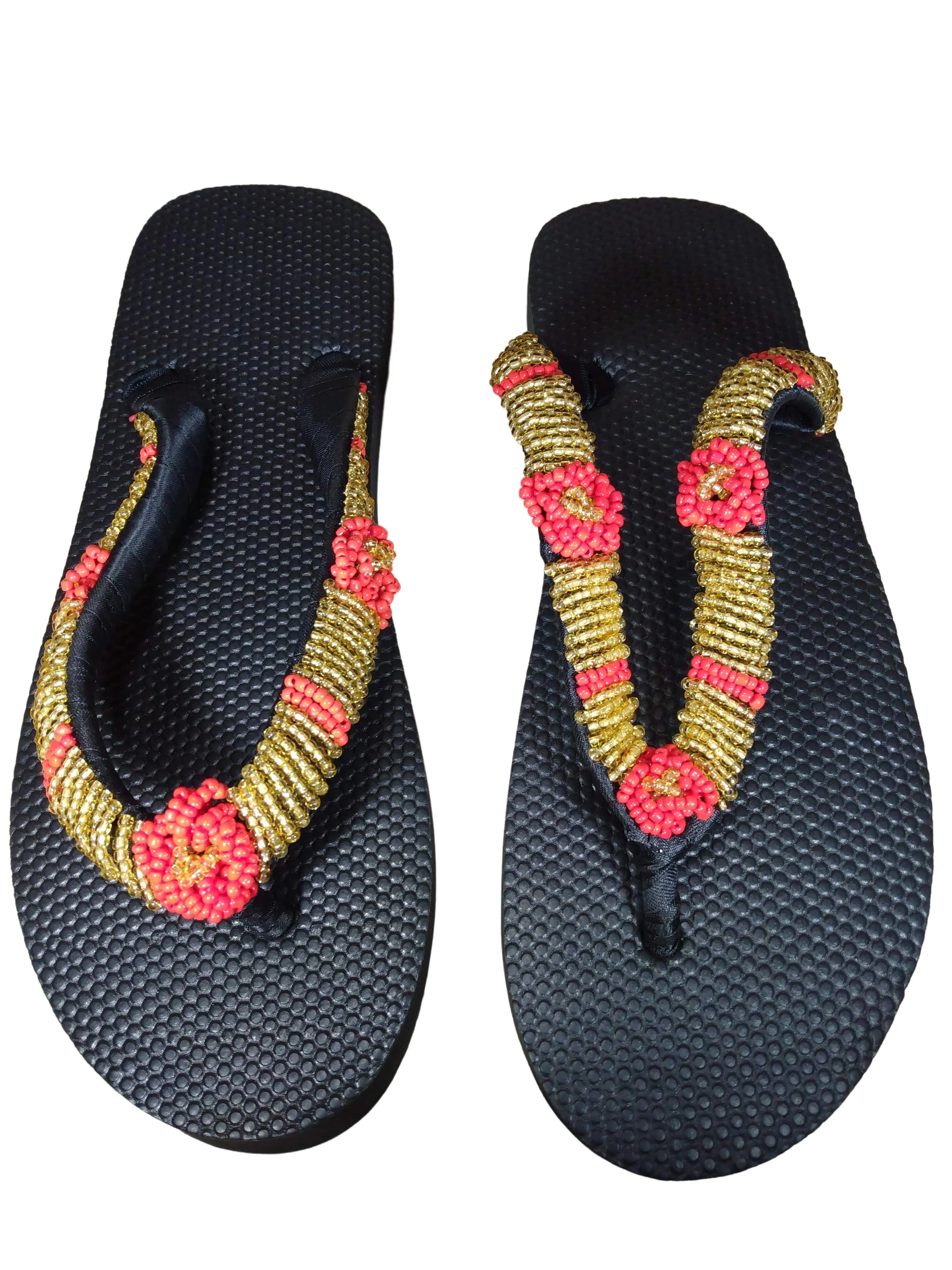 The campus sophisticate beaded flip flop are made by a group of tribal women in a small town in Nigeria. A member of this group helped fix the sandals of a white American woman who was touring a street market in this Nigerian city with her husband. After fixing the broken sandals on the spot for free and handing it back to the woman with a big smile on her face, the white woman smiled back saying, "you should make sandals because you are so good at it." She gave the African woman a $20 tip, hugged her,