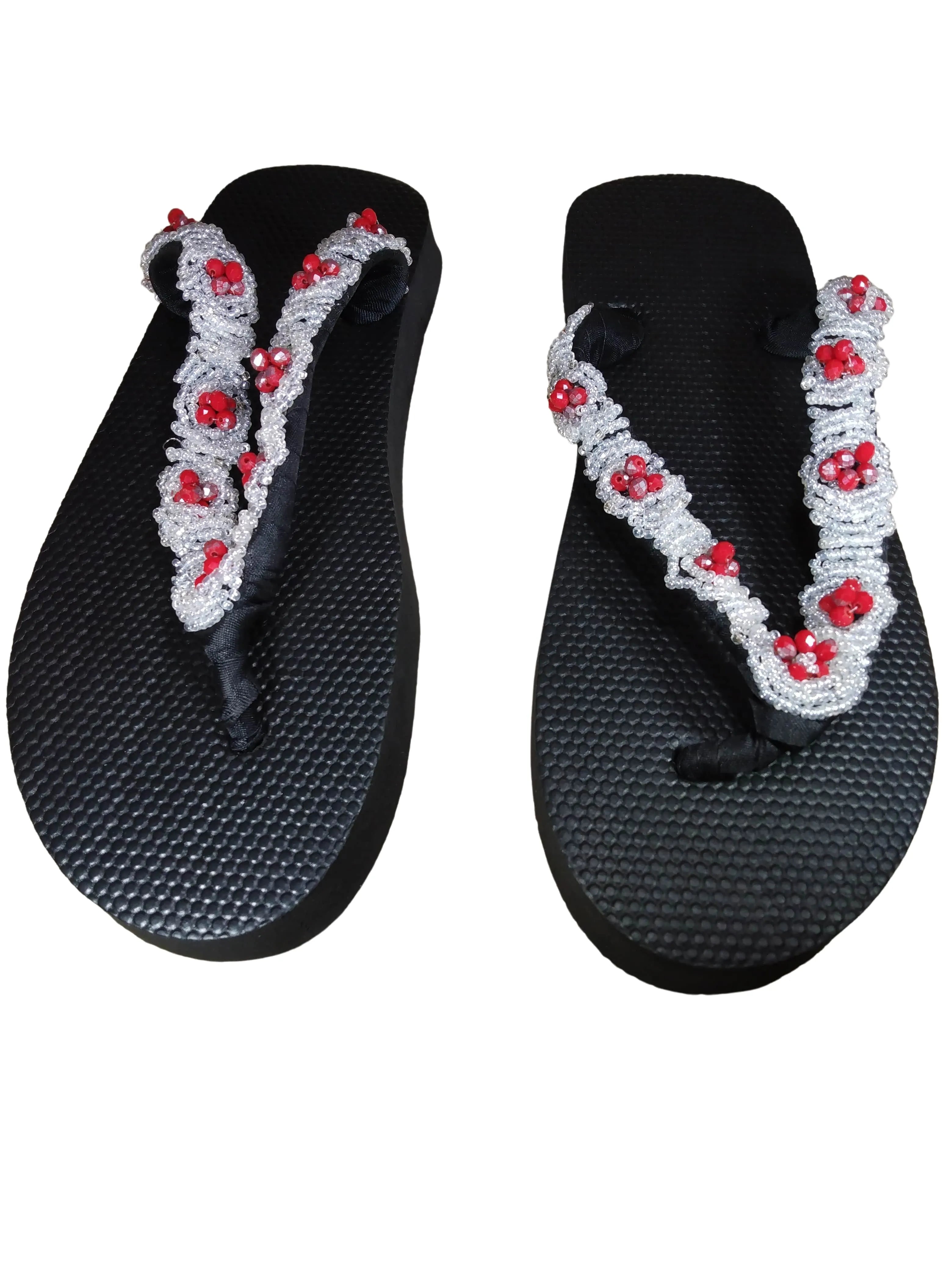 Beaded Unisex Flip Flop Silver Red Size 12.5 (measure 11")