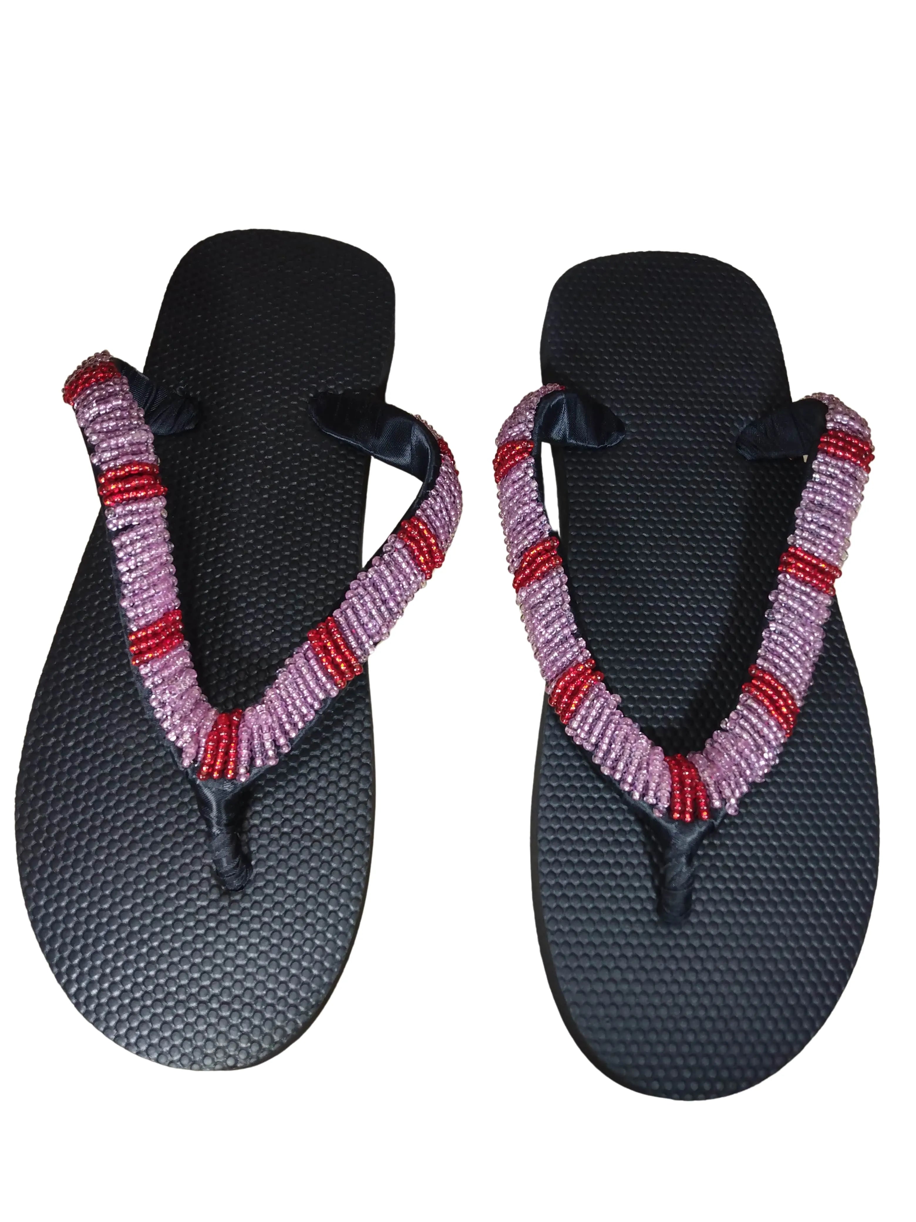 This pair of beaded flip flops from Nigeria is perfect for your indoor and outdoor summer activities. A beautiful selection of beads to make your feet sparkle. Designed to prevent slipping and sliding.