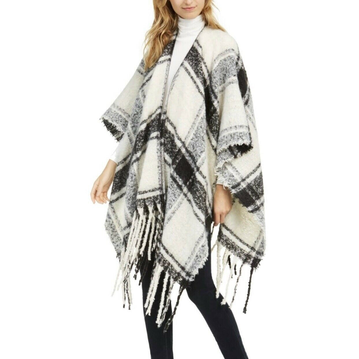 Charter Club Brushed Fringed Topper in Black & White Plaid. Extra-long fringe brings the drama to this stylish plaid topper from Charter Club.