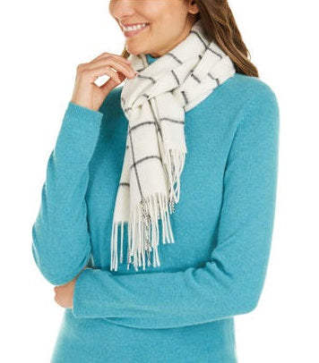 Charter Club Windowpane Woven Cashmere Fringe Scarf in Black & White. Timelessly sophisticated in windowpane plaid, this versatile Charter Club scarf is styled in ultra-soft cashmere for a luxurious feel.