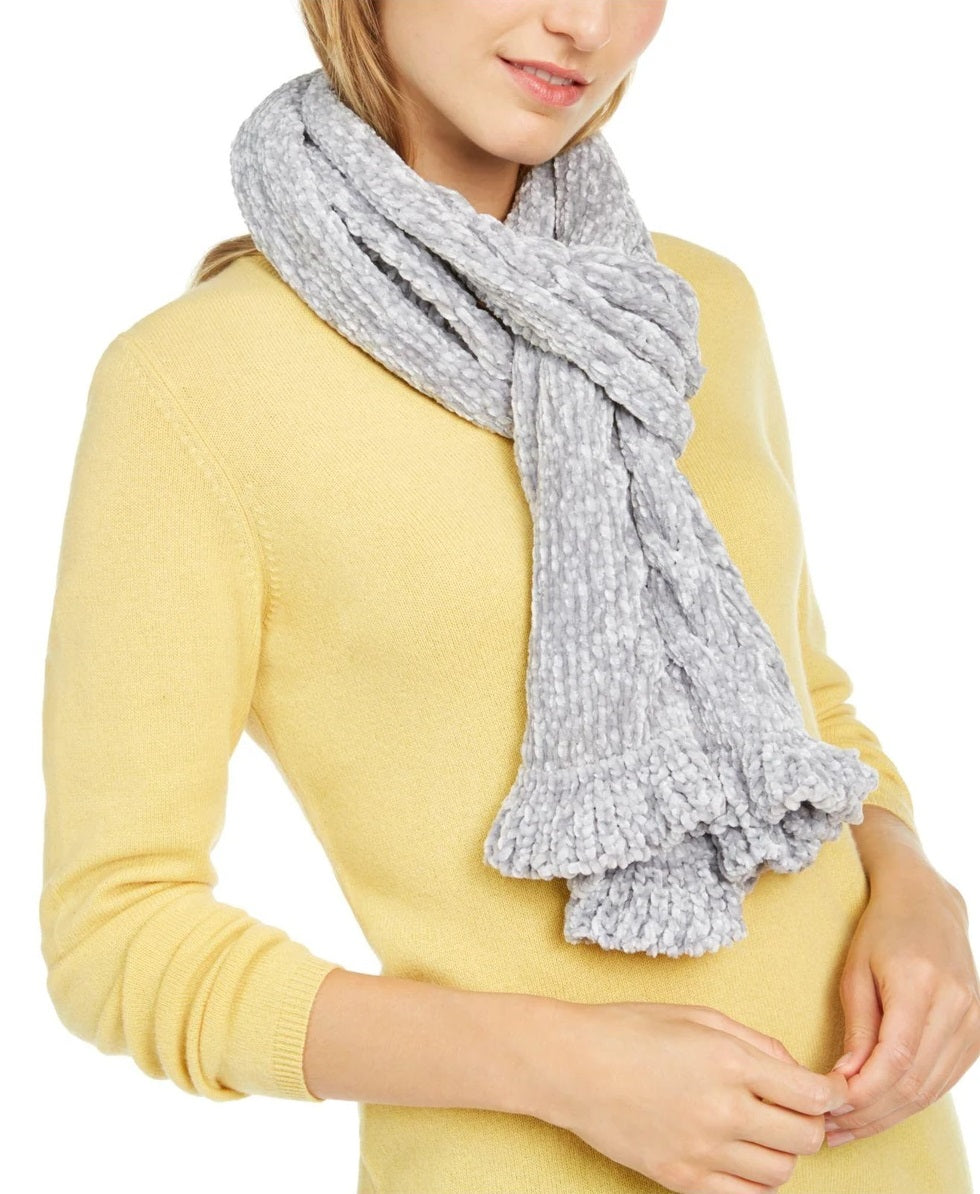 Charter Club Cable Ruffle Chenille Muffler Scarf in Grey. Effortlessly comfy and cozy, Charter Club's muffler scarf features subtle ruffles at the ends.