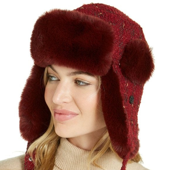 INC International Concepts Woven Shine Faux Fur Trapper in Wine. A hint of metallic shine combines with fabulous faux fur on I.N.C. International Concepts' essential woven trapper hat.