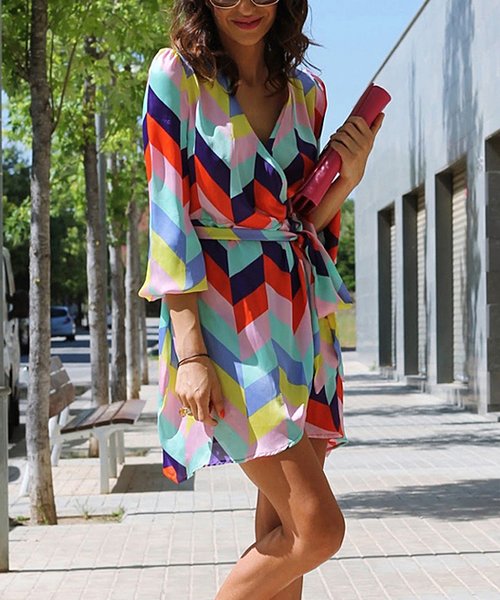 Blue & Orange Geometric Tie-Waist Surplice Dress