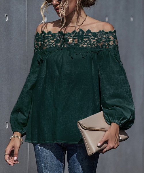 Dark Green Lace-Trim Off-Shoudler Tunic