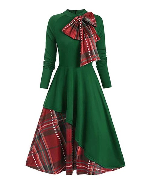 Green & Red Plaid Contrast Bow-Detail Fit & Flare Dress