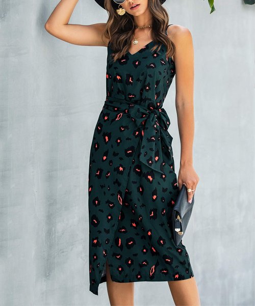 Dark Green Leopard Tie-Waist Sleeveless Maxi Dress