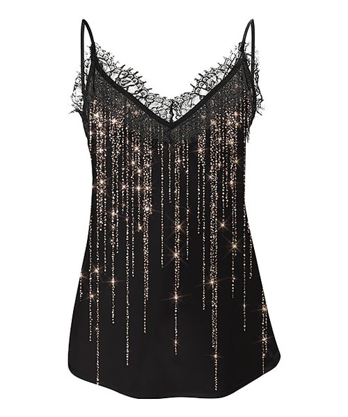 Black & Gold Sparkle Drip Lace-Trim Tank
