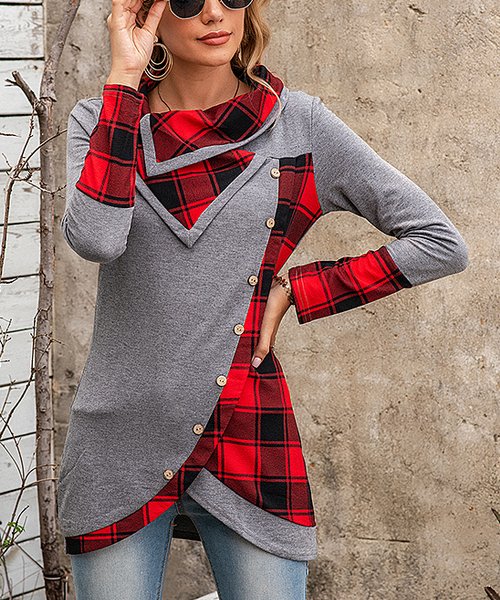 Deep Gray & Red Buffalo Plaid Asymmetric Button-Accent Coat