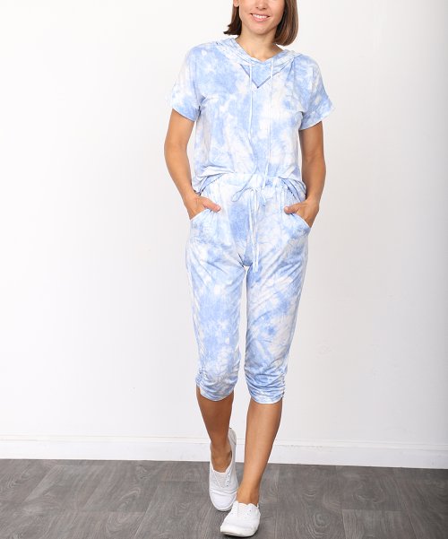 Blue Tie-Dye Short-Sleeve Pullover Hoodie & Capri Joggers