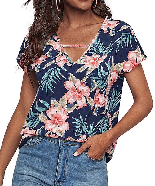 Royal Blue & Pink Floral Cutout V-Neck Tee