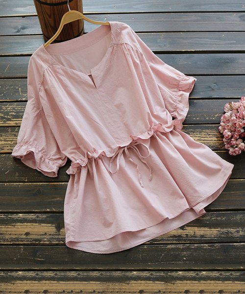 Pink Notch-Neck Tie-Waist Ruffle Tunic