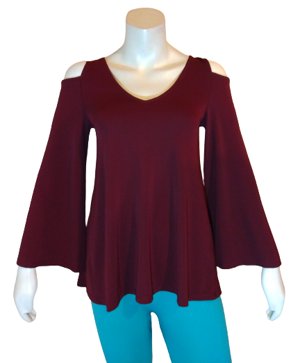 Wine Long Sleeve Cut Out Shoulder Top 68% Acetate, 27% Polyester, 5% Spandex