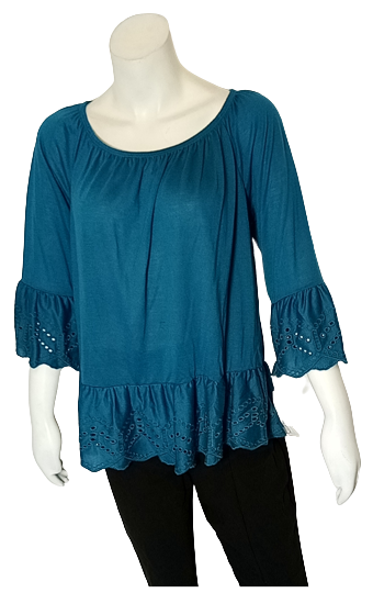 Turquoise Fever 3/4 length ruffle embroidered edge blouse