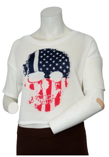Let her style stand out with the Hera Collection Girls' White Skull & American Flag Sweater. This edgy design features a bold skull graphic layered over an American flag motif, perfect for girls who love fashion with attitude. Made from a soft and durable blend of 40% rayon, 40% acrylic, and 20% polyester, the sweater offers a comfortable fit with a touch of stretch. The medium size is ideal for girls around ages 7 to 8, providing a relaxed yet flattering silhouette.