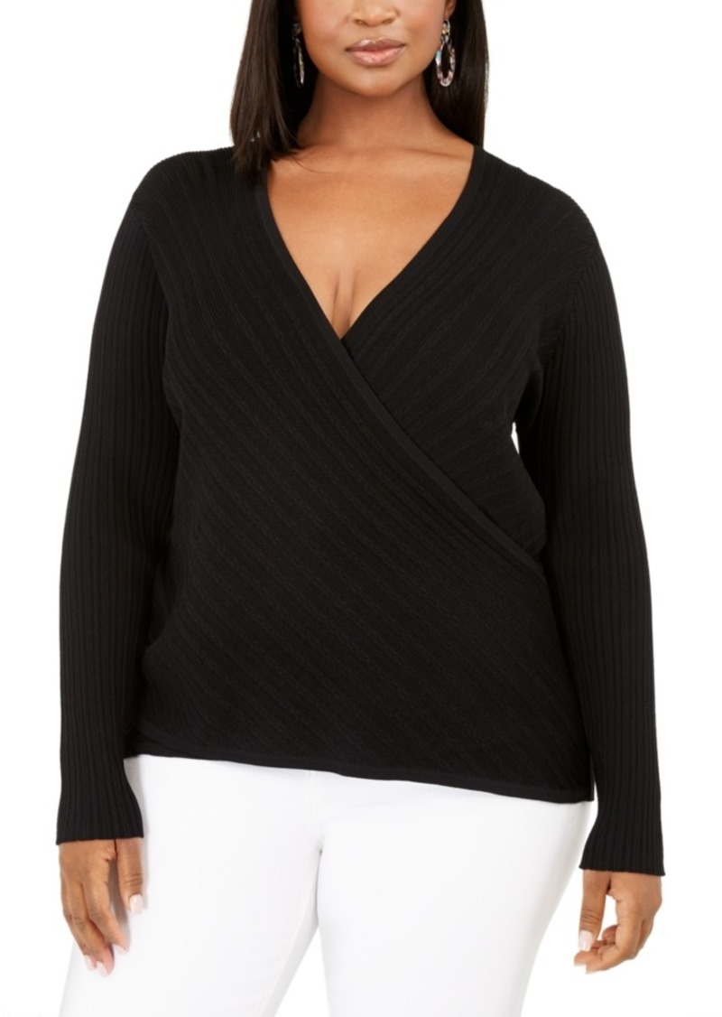 Order your INC International Concepts Plus Size Pointelle Surplice Sweater in Deep Black today and unlock a world of effortless sophistication and cozy comfort!