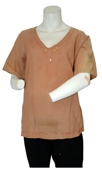 Add a touch of glamour to your casual wardrobe with this burned orange short sleeve women's shirt from Kaaku Clothing. Featuring shimmering sequins, it's perfect for special occasions or night out.