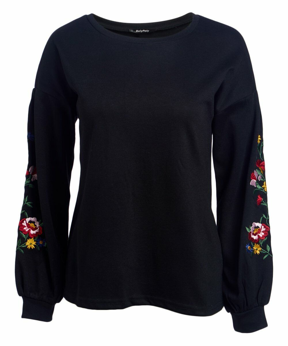 Black Floral-Embroidered Bishop-Sleeve Top size S