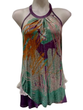 Libertalia Gray/Purple Lace Detail Printed Spaghetti Strap Blouse