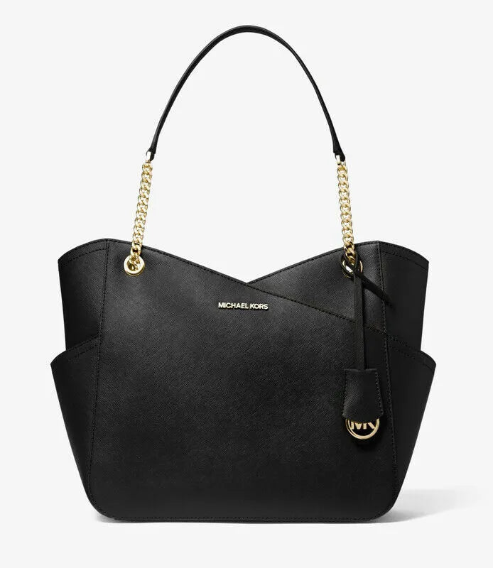 Michael Kors Jet Set Travel Large Cross Chain Saffiano Leather Shoulder Tote in Black with Gold-Tone Hardware