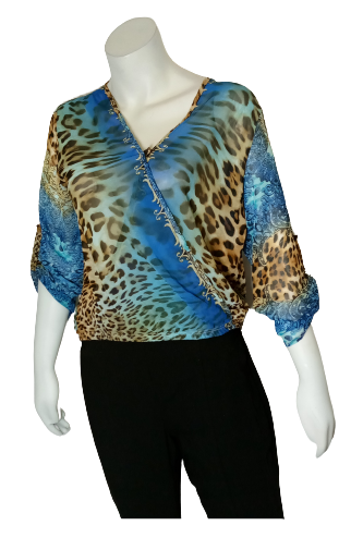 Cheeky Long Sleeve Sheer Blue/Brown Leopard Pattern Gathered Waist Top