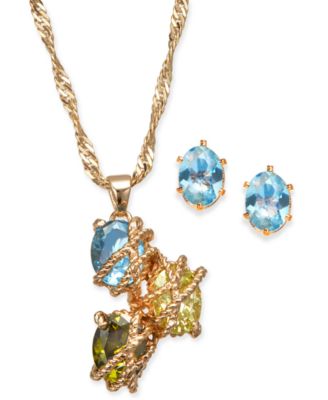 Charter Club Gold-Tone Multi-Stone Wrapped Pendant Necklace and Stud Earring Set. A wrapped pendant necklace and coordinating stud earrings come together in this beautiful multi-stone set by Charter Club, set in gold-tone mixed metal. Approximate length: 15" + 3" extender.