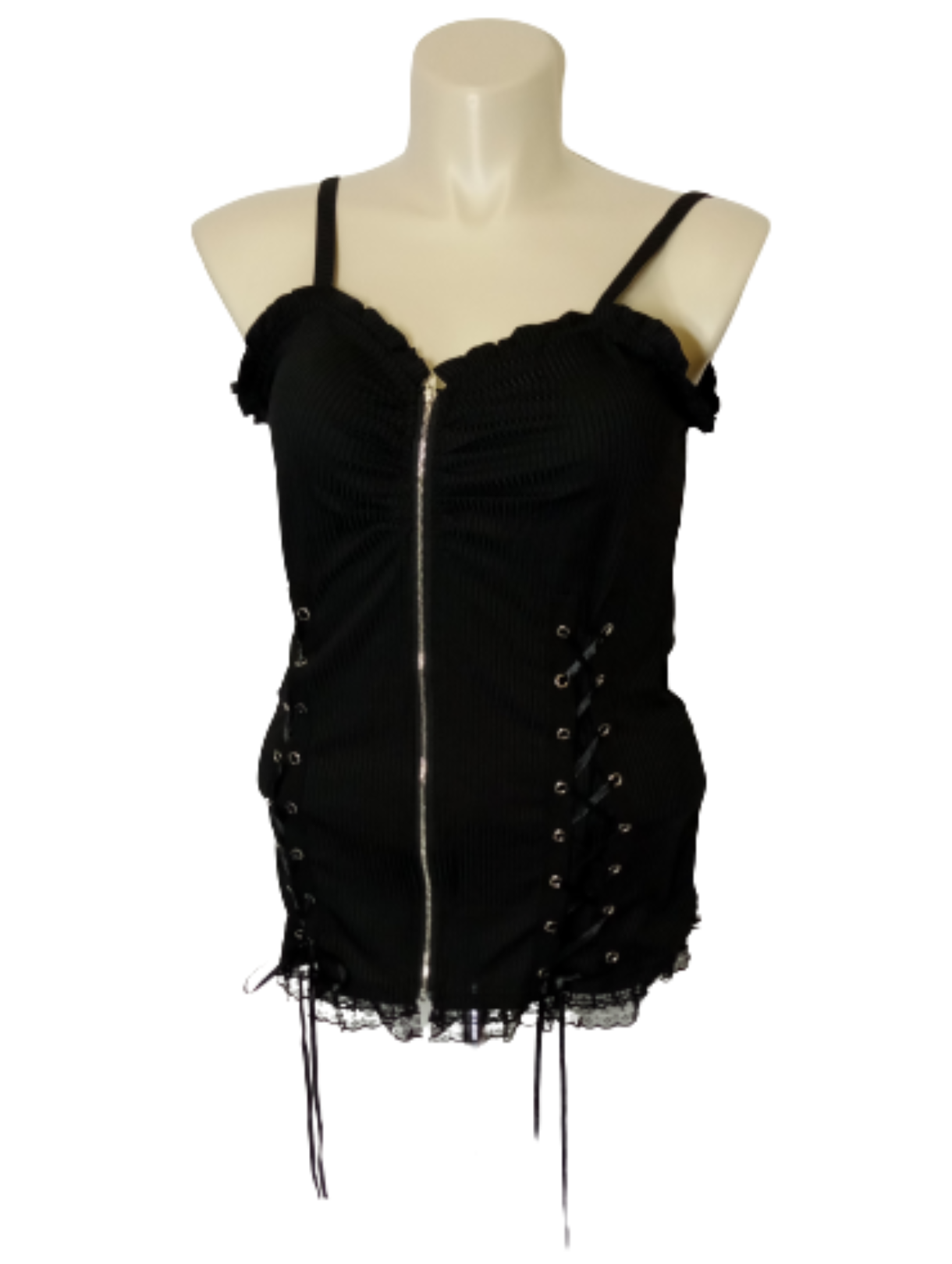 Top, Plus, 1XL, Spaghetti Straps, Zipper Front, Lace-ups, Lace Trim, Front Rusching, Black