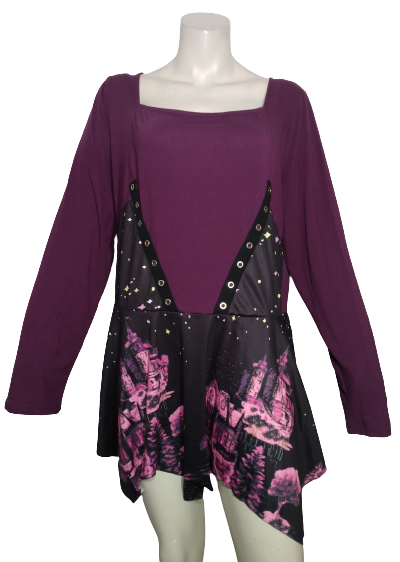 Top, Plus, 3X, Asymmetrical, Eyelets, Buildings, Trees, Purple, Pinks, Black
