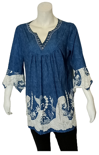 Top, Plus, Large, Asymmetrical, Denim Print, Flowers, Leaves, Blue, Greys