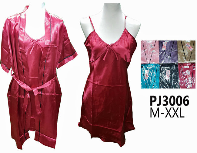 Pretty and silky 2 pc. soft satin charmeuse robe and chemise set with piping.