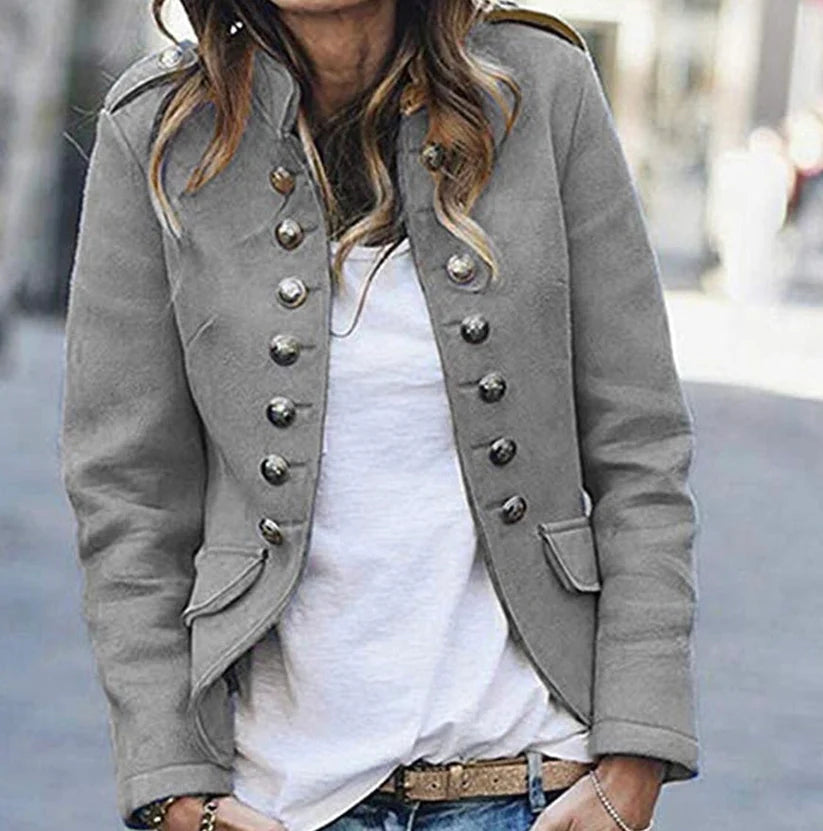 Embrace timeless style and sophistication with the Suvimuga Gray Button-Accent Blazer!