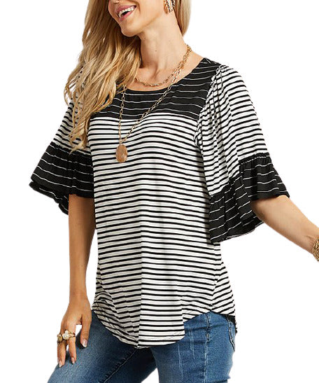 White & Black Stripe Color Block Ruffle-Sleeve Curved-Hem Tunic size S