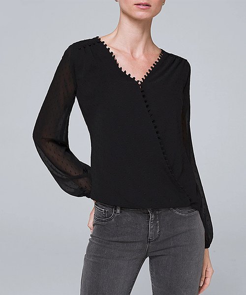 Black Swiss Dot Sheer-Sleeve Surplice Top
