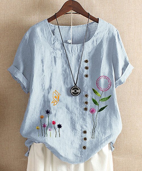 Blue Floral Embroidery Scoop-Neck Button-Detail Top