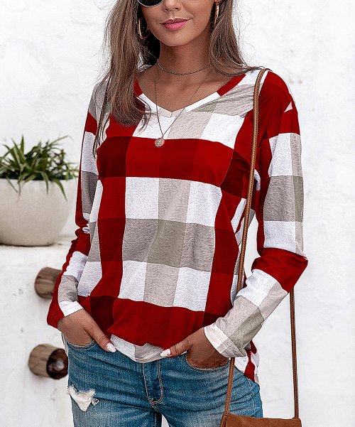 Red & Taupe Plaid V-Neck Long-Sleeve Top